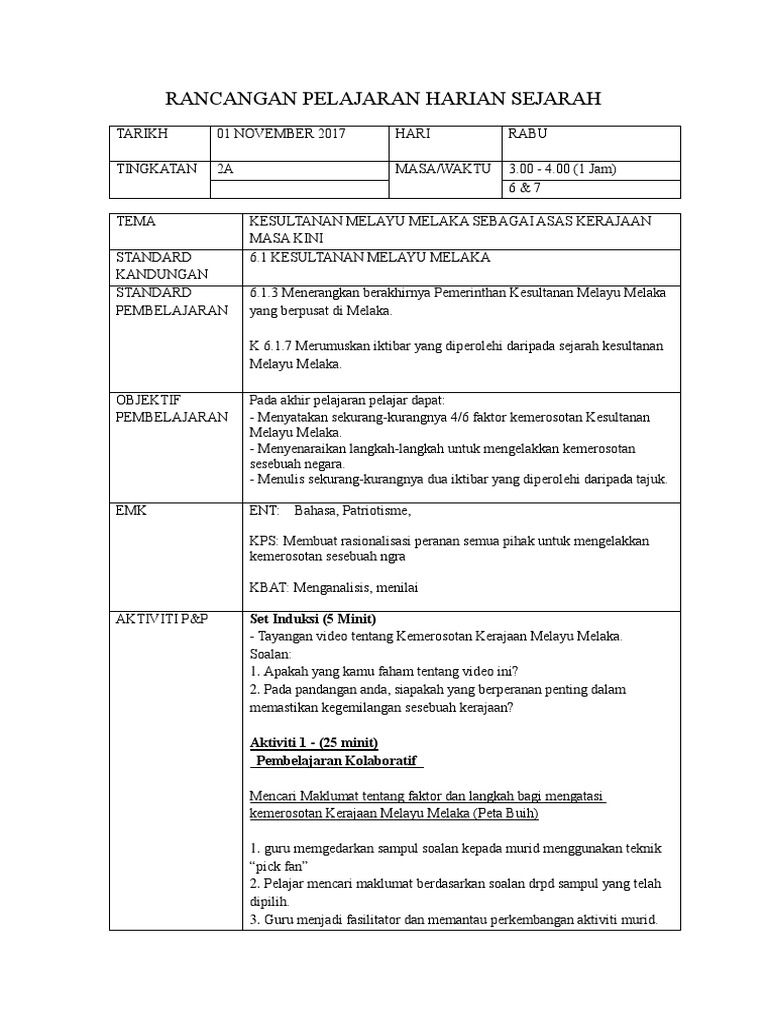 Doc Rancangan Pelajaran Tahunan Sejarah Tingkatan 2 Tahun 2018 Tema Warisan Negara Tajuk 5 Kerajaan Alam Melayu Halim Afif Academia Edu