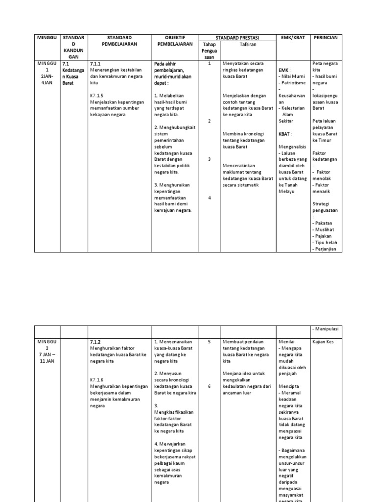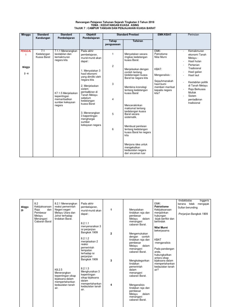 7 1 Kedatangan Kuasa Barat Rancangan Pengajaran Harian Sejarah Mata Pelajaran Dan Kelas Masa Tema Standard Kandungan