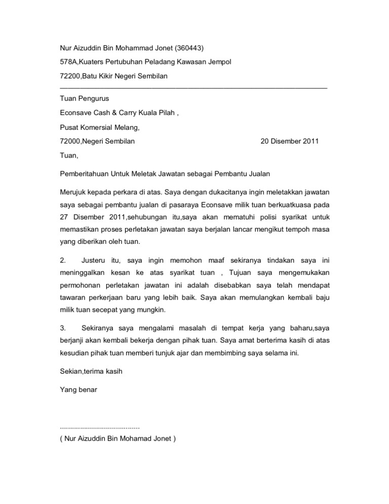Doc Surat Berhenti Kerja Dan Juga Perletakan Jawatan Hazimah Isa Academia Edu