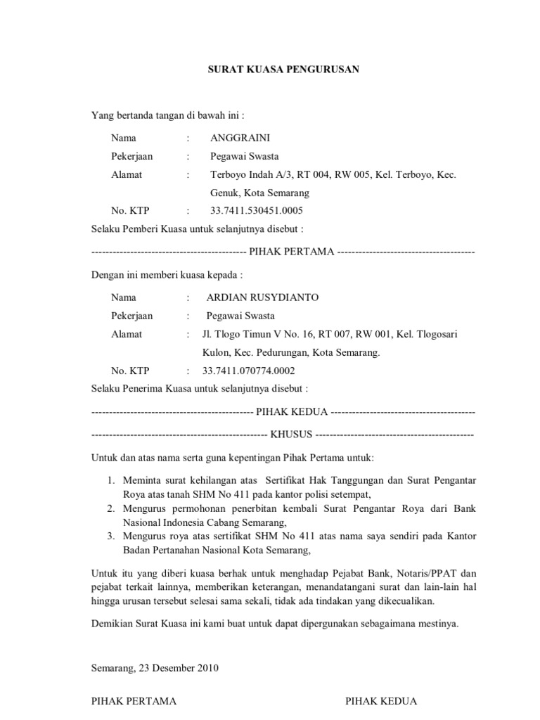 Contoh Surat Kuasa Pengurusan Sertifikat Tanah Doc Dapatkan Contoh
