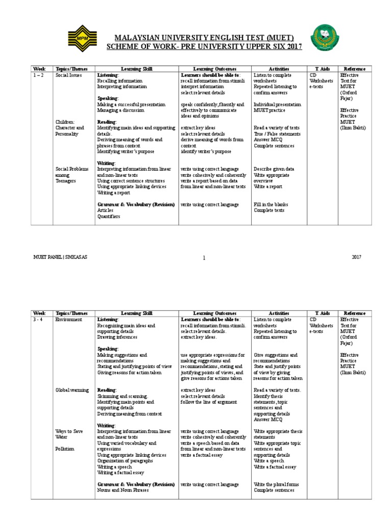 Muet Scheme Of Work Upper 6 Essays Vocabulary