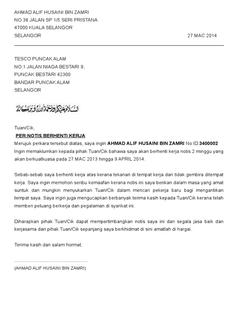 Contoh Cara Nak Tulis Notis 24 Jam 2 Minggu Sebulan 4 Surat Resign Bahasa Melayu Yang Lengkap