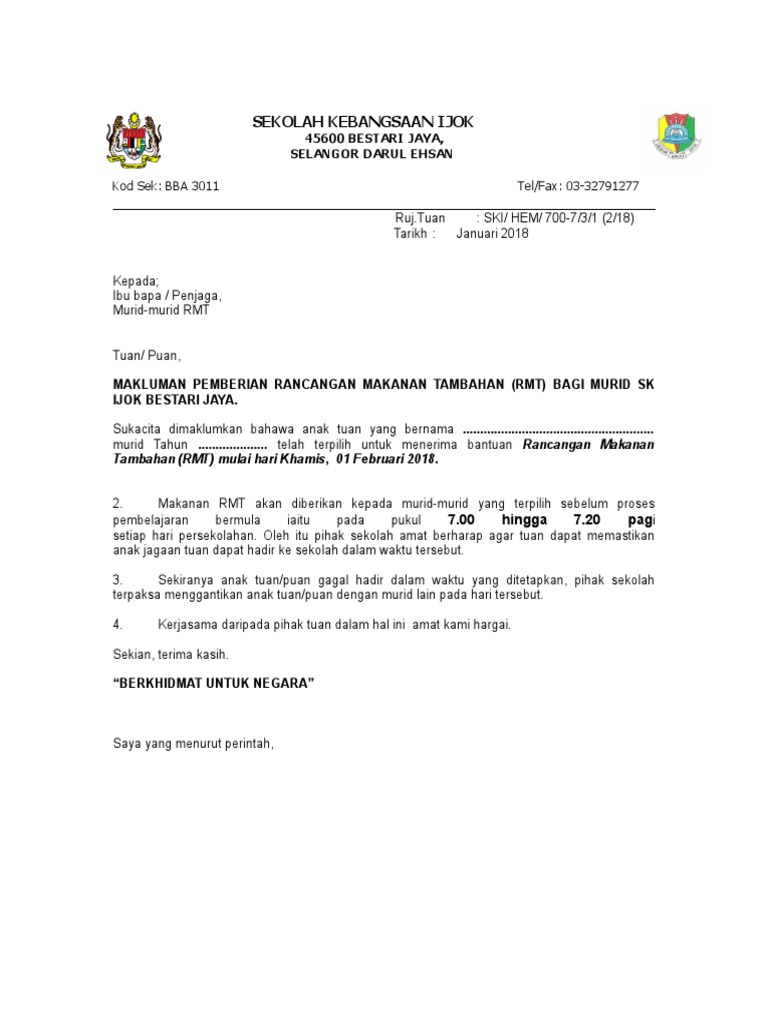 Contoh Surat Makluman Ibu Bapa Utk Program