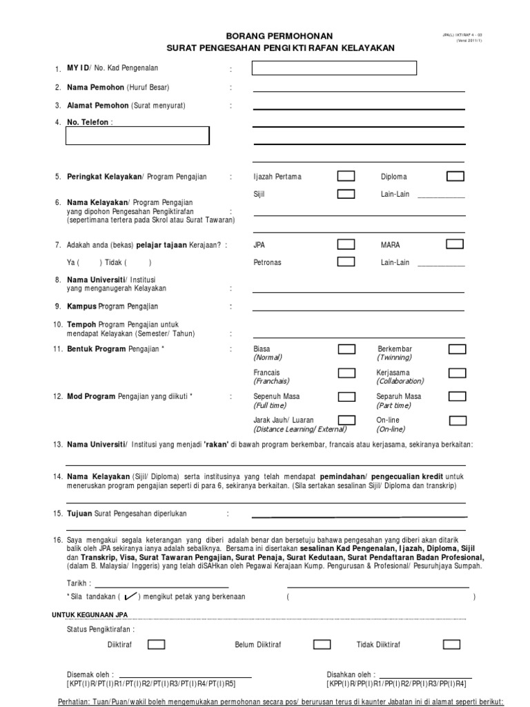 Borang Permohonan Surat Pengesahan Pengiktirafan Kelayakan